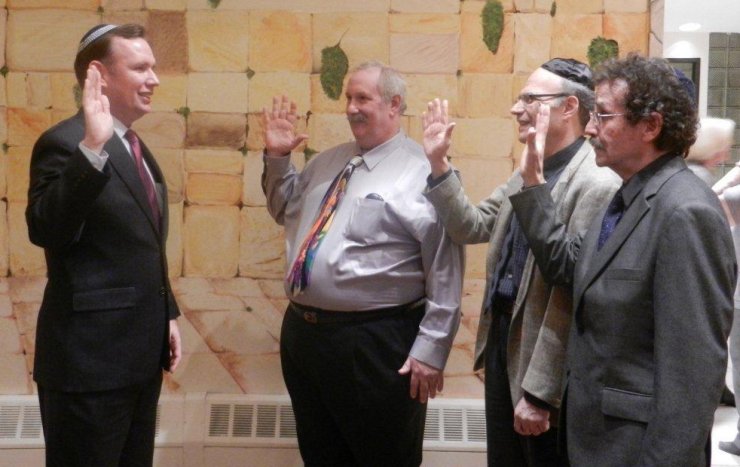 New York State Assemblyman Michael Cusick administering the oath of office in January 2012 to (from left) then-president Mickey Berkofsky, and vice presidents Joel Epstein and the late David Rabin.